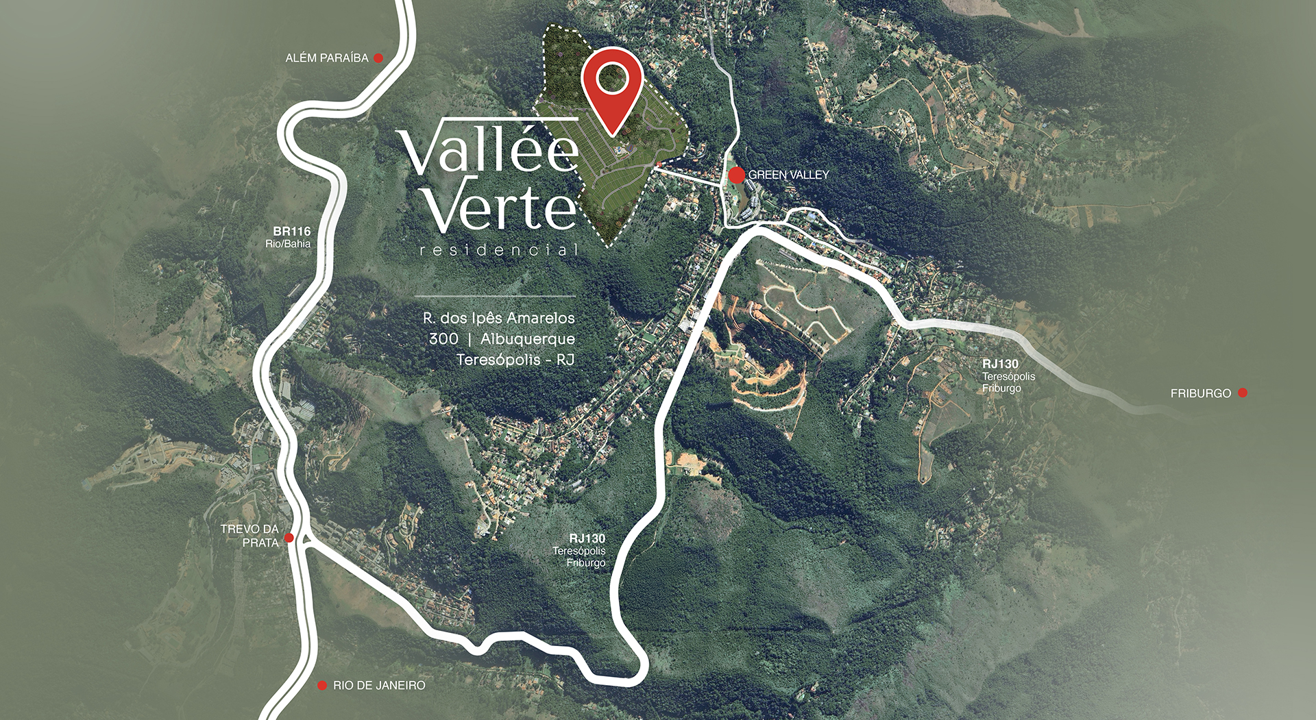 Situado em uma das regiões mais encantadoras de Teresópolis, cidade reconhecida por seus índices de segurança pública acima da média, o Vallée Verte está inserido no Green Valley, com fácil acesso pela RJ130, a charmosa rodovia Teresópolis Friburgo. A 15 minutos do centro da cidade, oferece toda a tranquilidade e o contato com o verde. Um lugar onde a contemplação das montanhas e o pôr do sol fazem parte da rotina.